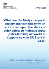 This report from Foresight, Government Office for Science examples what are the likely changes in society and technology which will impact upon the ability of older adults to maintain social (extra-familial) networks of support now, in 2025 and in 2040.